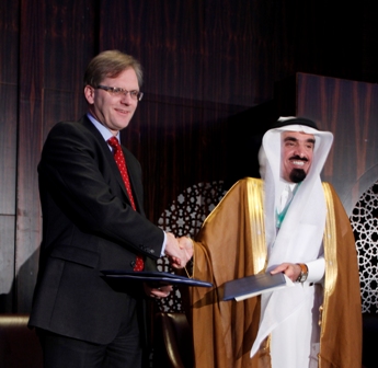 Vernon Soare, ICAEW’s Executive Director exchanges official documents with Mohammed Salih Al-Obailan, the Chairman of GCCAAO, after the two Faculties signed an agreement to develop an Audit Quality Monitoring Programme for the GCC countries.